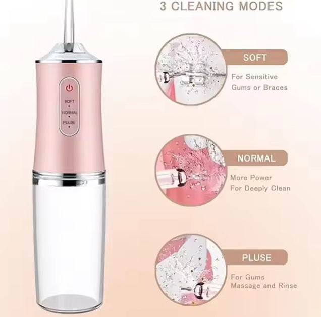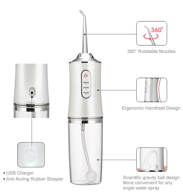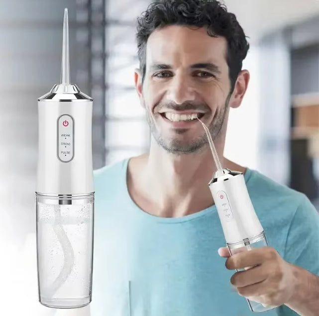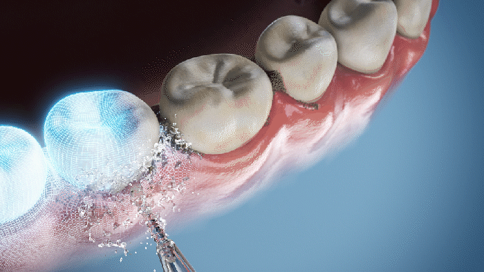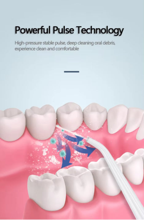 Uses pressurised water to flush out food debris and plaque from between teeth and along the gumline — no string, no scraping, no forcing debris deeper.