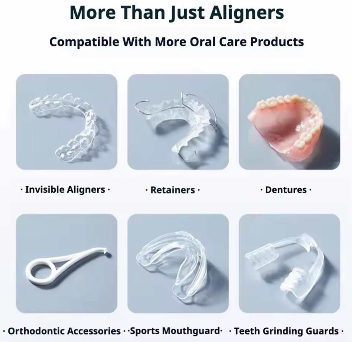 Compact and USB rechargeable, it’s perfect for home, travel, or daily use — giving you cleaner, clearer, and longer-lasting dental appliances with zero hassle.